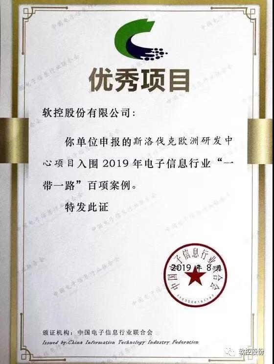 軟控股份有限公司榮獲2019電子信息行業(yè)“一帶一路”項目優(yōu)秀企業(yè),軟控“斯洛伐克歐洲研發(fā)中心”項目成功入選2019年電子信息行業(yè)“一帶一路”百項案例。