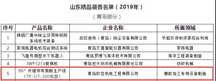 近日,山東省工業(yè)和信息化廳發(fā)布了《山東精品裝備名錄(2019年)》,軟控90°纖維簾布裁斷生產(chǎn)線(TP-3/T-300機型)成功入選“山東精品裝備”行列。