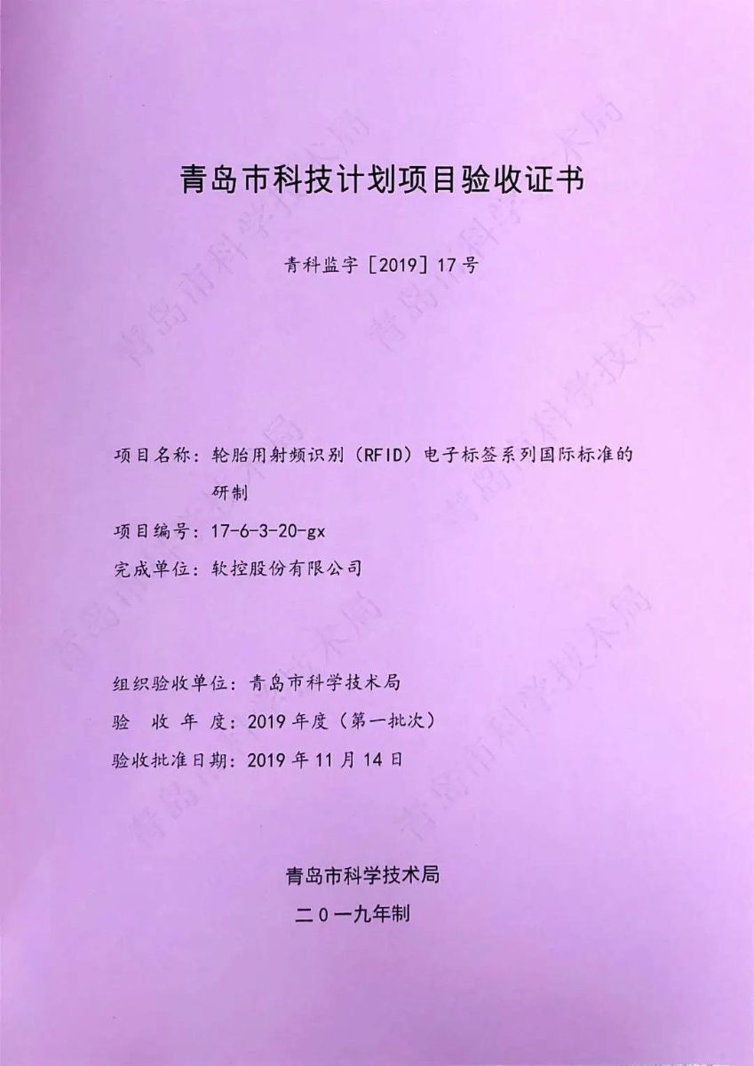 近日,軟控承擔(dān)的2017年青島市民生科技計劃項目“輪胎用射頻識別(RFID)電子標(biāo)簽系列國際標(biāo)準(zhǔn)的研制”順利完成全部驗收工作,青島市科學(xué)技術(shù)局下發(fā)青島市科技計劃項目驗收證書。