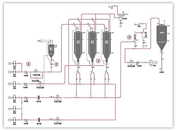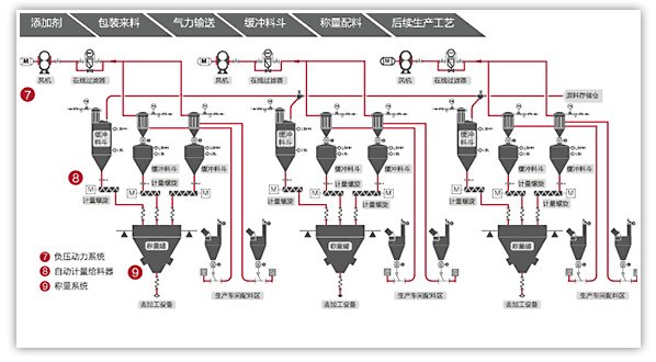 用于塑料改性的多個(gè)生產(chǎn)過(guò)程(包括主料、添加劑)的自動(dòng)輸送與配料系統(tǒng)。整個(gè)過(guò)程清潔環(huán)保,粉體處于密閉輸送狀態(tài),與外界隔絕,具體流程可按客戶具體生產(chǎn)要求制定。