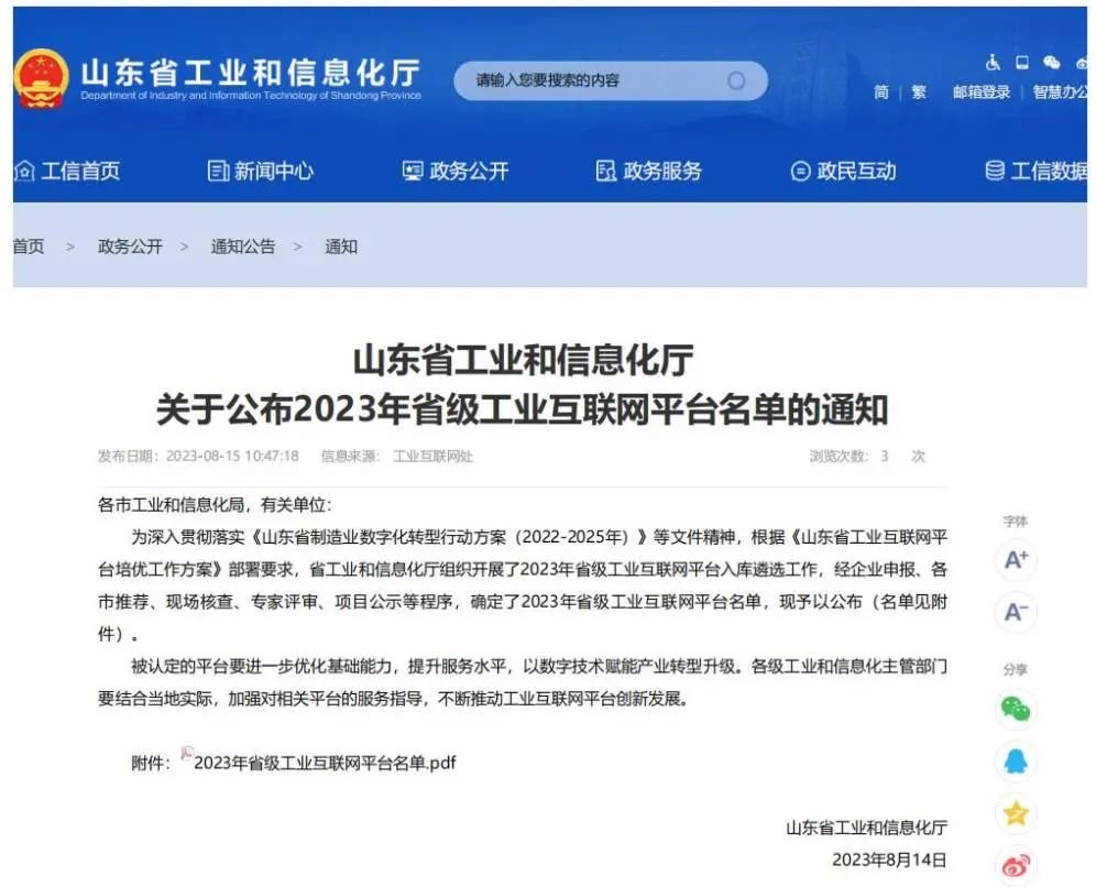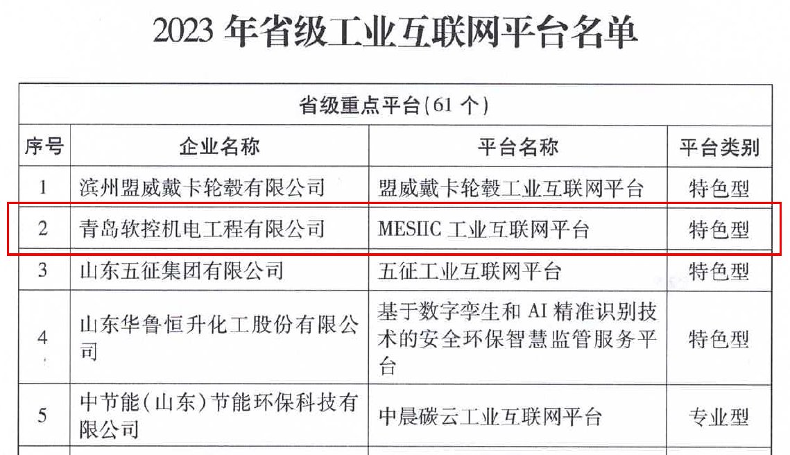 8月14日,山東省工業(yè)和信息化廳公布2023年省級工業(yè)互聯(lián)網(wǎng)平臺名單,青島軟控機(jī)電工程有限公司的“MESIIC工業(yè)互聯(lián)網(wǎng)平臺”成功入選省級重點(diǎn)平臺(特色型)。